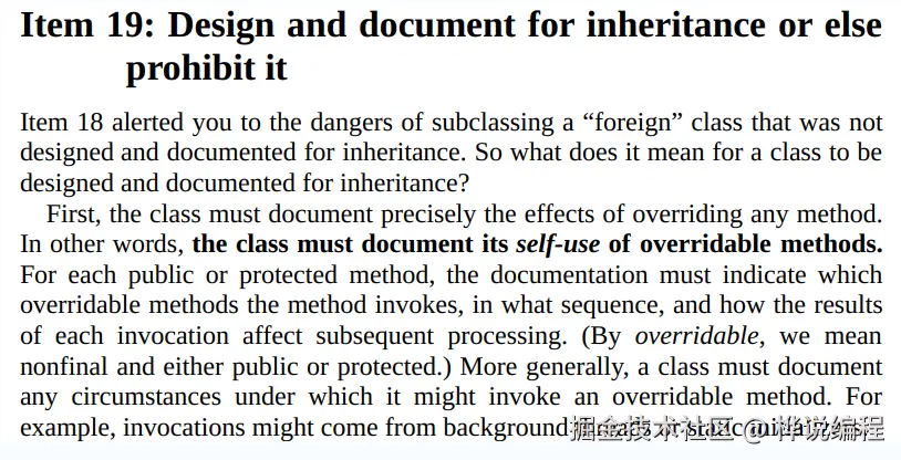 final修饰的方法,无论是公开还是保护的。)更一般地说,一个类必须文档说明任何可能调用可重写方法的情况。 例如,后台线程或者静态初始化代码块可能会调用这样的方法。