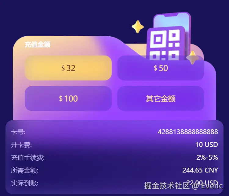 如果会长期使用一张卡,那建议一次性就多充值一些,扣掉开卡费之后实际到账的实打实的,而不会口表手续费,后续的充值是会扣掉手续费的(能省就省)