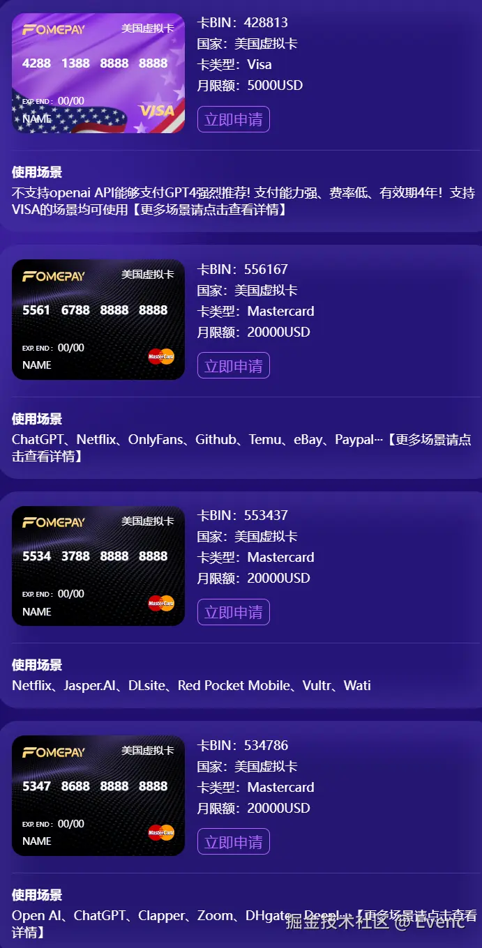 适用范围非常广泛,只要是支持美国VISA卡的场景均可。不同的号段也有不同的支持范围,下表是目前的几张卡支持的服务(2024.7.21更新)