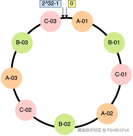 你可以看到,节点数量多了后,节点在哈希环上的分布就相对均匀了。这时候,如果有访问请求寻址到「A-01」这个虚拟节点,接着再通过「A-01」虚拟节点找到真实节点 A,这样请求就能访问到真实节点 A 了。