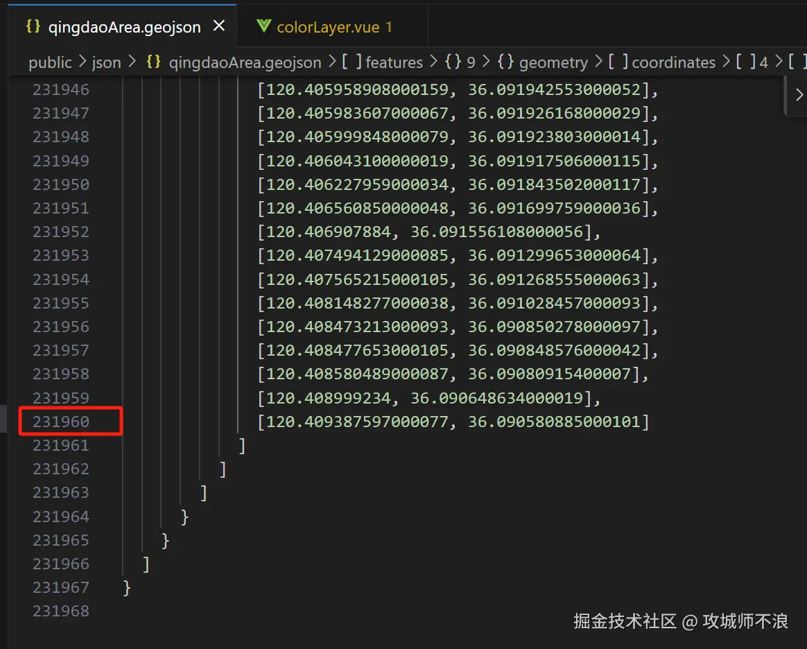 好了,接下来我要渲染整个青岛市10个区/县的色块,可以先看下这惊人的数据量