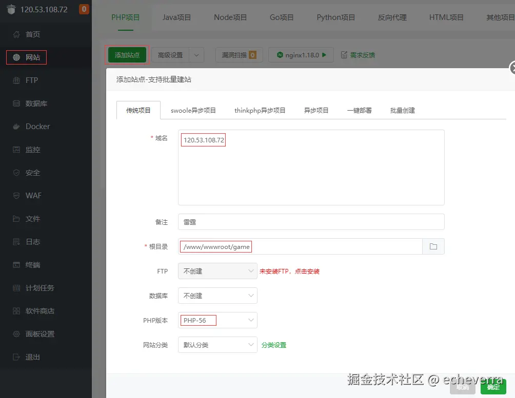 新版雷霆传奇需要创建一个站点,域名为 IP,根目录为 /www/wwwroot/game,PHP 选择 5.6 版本。