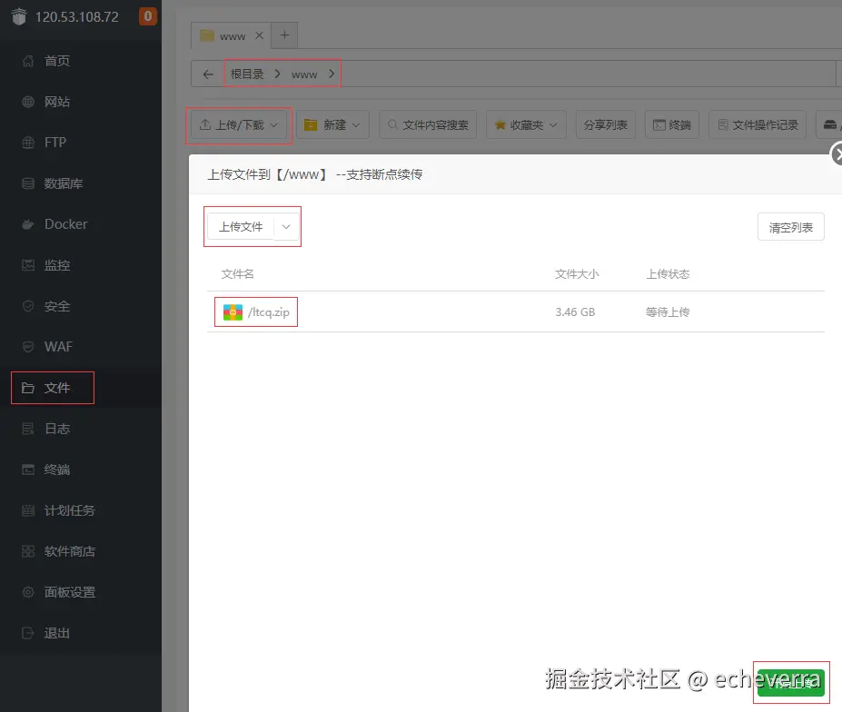 拿到源码后,将ltcq.zip压缩文件通过宝塔上传到根目录,由于最新的宝塔禁止直接上传到根目录,可以先上传到任一目录下,再剪切粘贴到根目录。