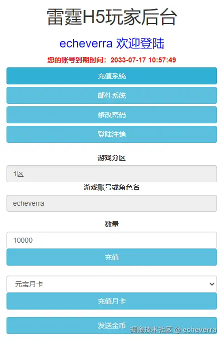 给玩家授权后,同样打开 GM 后台:http://IP/gm,登录授权的账号和设置的授权密码,玩家就可以自己充值和发送物品了。