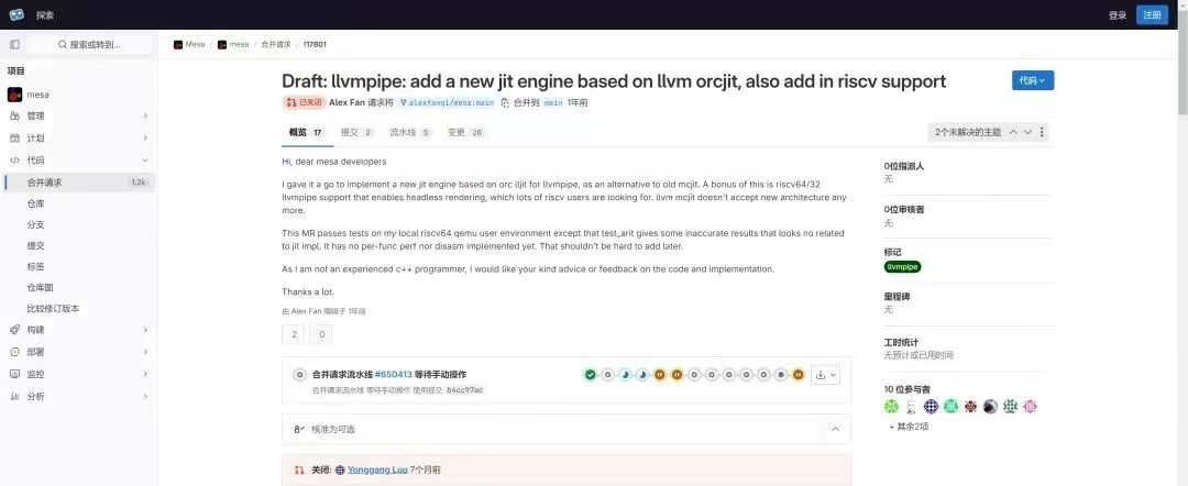 然而,就在 riscv64 平台的开源桌面生态即将迎来曙光的时候,世事难料,随着 mesa 开发分支的高速推进,原来的 Merge Request 缺乏维护,与主线的差异和冲突越来越大,渐渐的被淹没在冗长的 MR 列表中,逐渐被人淡忘。