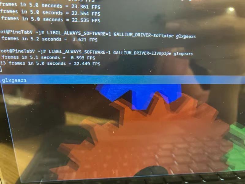 11 月 1 日,@YukariChiba 在某个群组里发布了一张在飞腾派上以开启了 ORCJIT 的主线 mesa 使用 LLVMpipe 运行 glxinfo 的截图,并在次日发布了一张在 PineTab-V 上使用 LLVMpipe 运行 glmark 的截图。