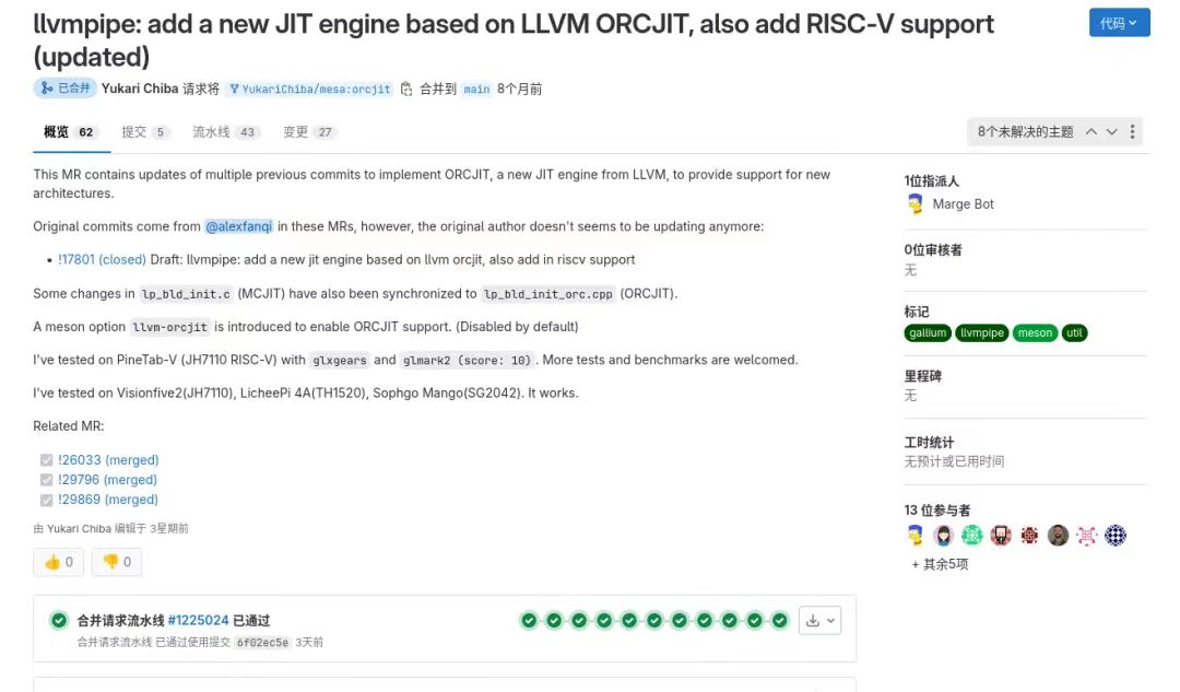 而这打破了 MR 评论区的宁静。在后续的 1 个月里,社区贡献者们对该 MR 提出了数十条修改意见;Dave Airlie (@airlied) 为帮助 ORCJIT 最终落地提交了数个前序修改和代码结构优化;MR 提交者 @YukariChiba 根据修改意见对 MR 提交内容修改了数十个版本,并最终在 6 月 28 日提交了最终版本。