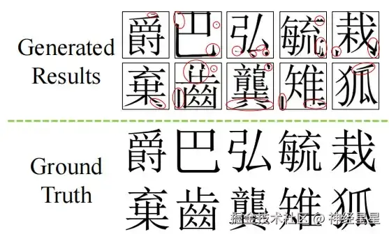 这是由于使用的是多对一训练方法,即将多个甲骨文实例与一个现代汉字图像进行映射,导致在捕捉字符演化时出现混淆和不准确, 并且由于现代汉字样本有限,导致出现了不完整的结构。