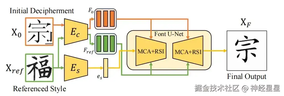 首先,通过对甲骨文图像 X 进行条件扩散以逼近初始图像 X0,然后通过零样本学习方法对其进行改进,并且利用 Xref 作为参考来纠正和增强结构。受益于改进过程中对文字结构的洞察,最终生成了对标现代汉字的文字结果 XF。