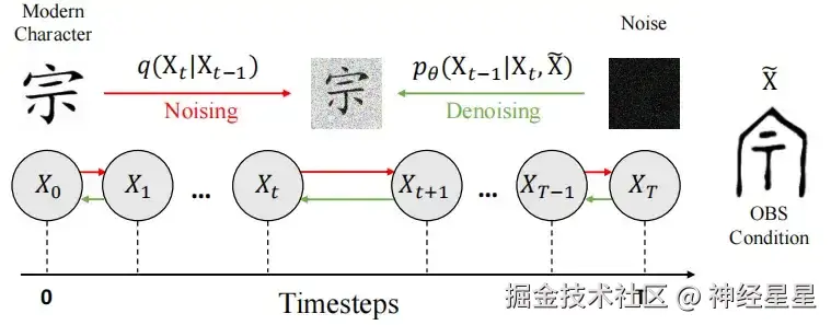 在前期阶段中 (Noising), 研究人员通过向现代汉字图像 X0 引入噪声,利用可控的马尔可夫链过程,将其过渡到类似于纯噪声的状态,最终形成高斯分布 N (0, I)。