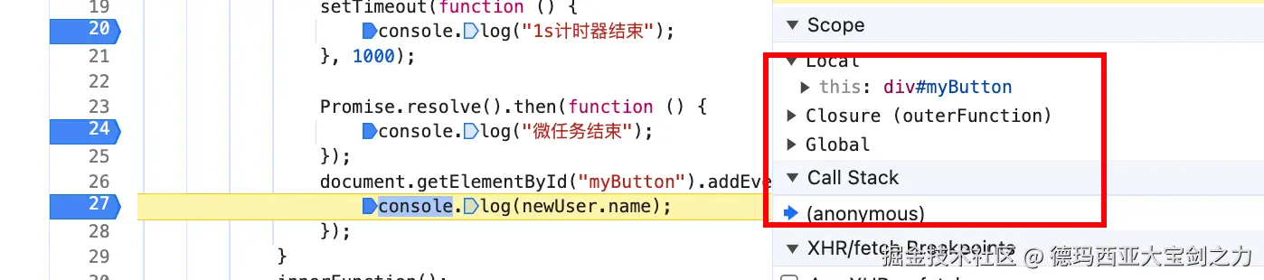 还记得有一个绑定用户点击的事件回调么?这个不属于js引擎核心部分,这里属于浏览器与js交流部分,与计时器、Promise一样,它也会触发EventLoop。这也解释了,为什么主程序已经执行结束了,还能再次调用堆栈进行运行。