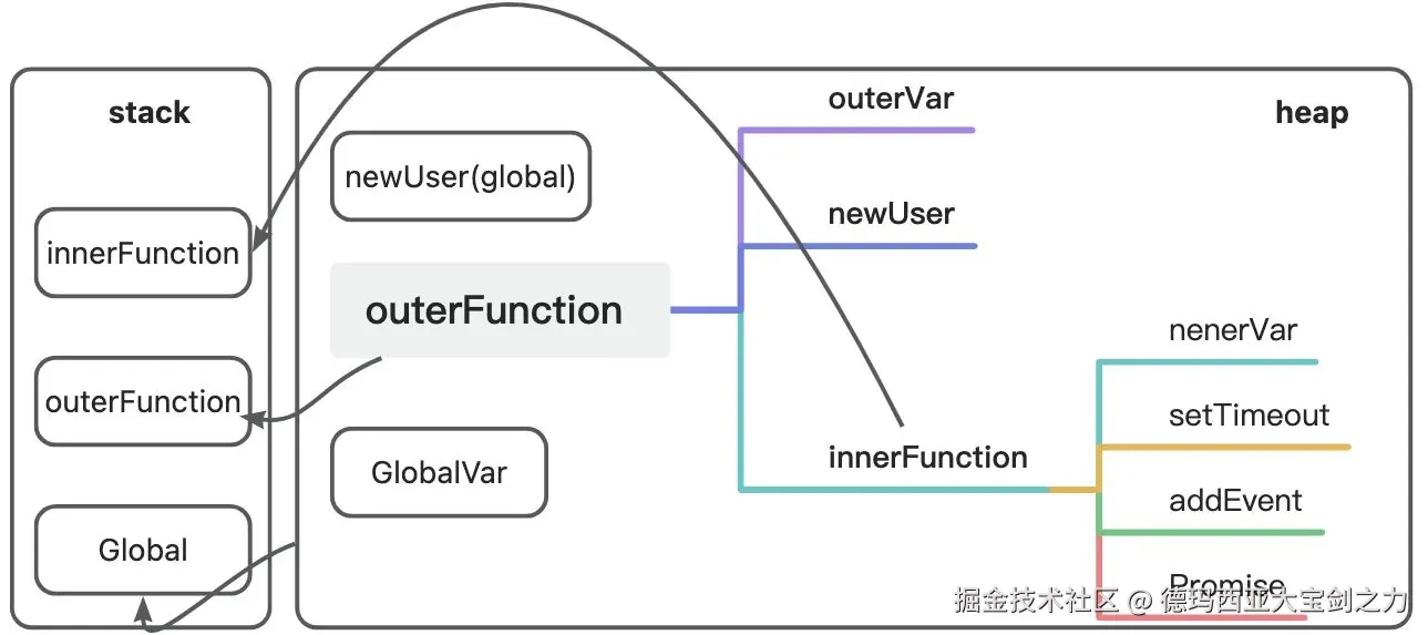闭包可以访问已经被移除栈的outerFunction的内部对象,保留对象的引用关系;