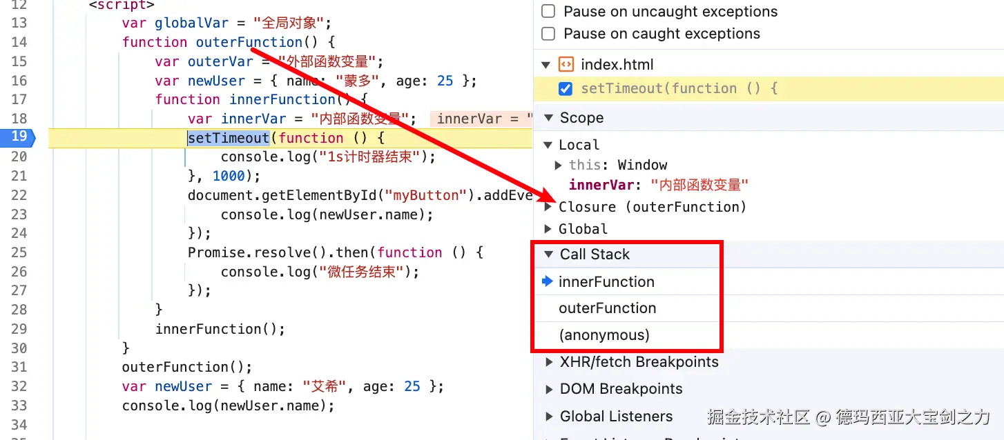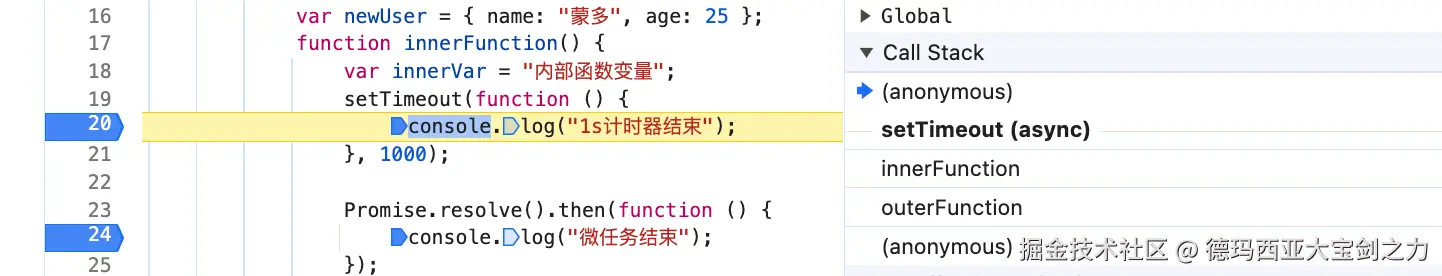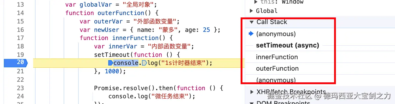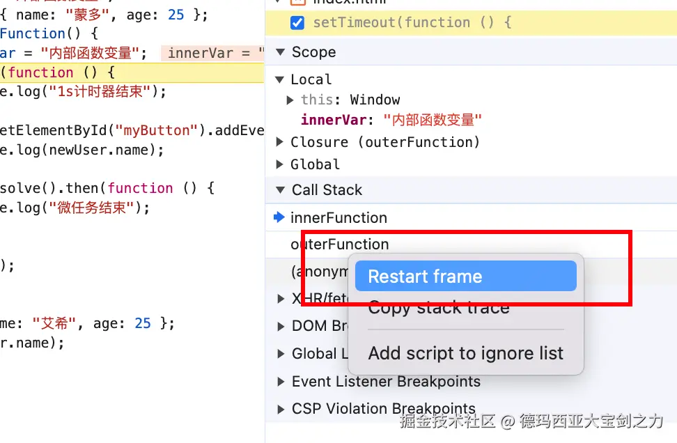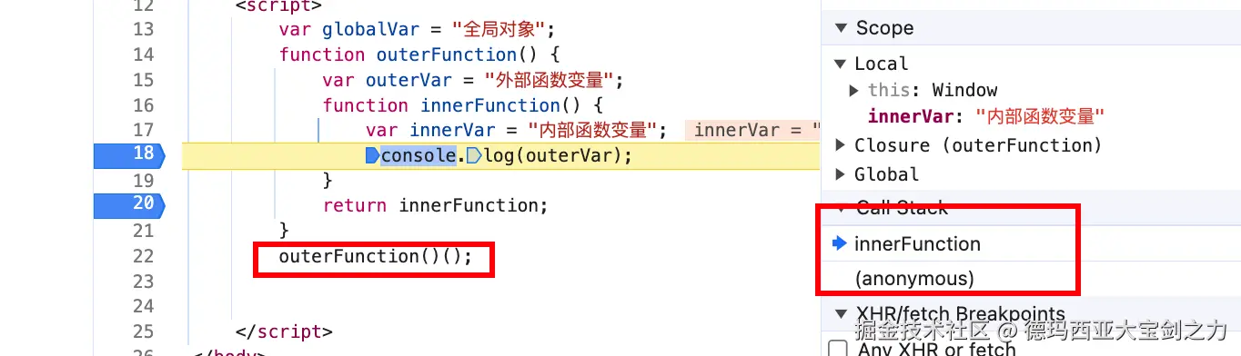 当前程序中,当我们执行闭包的时候,会发现栈帧列表变成了 global->innerFunction。