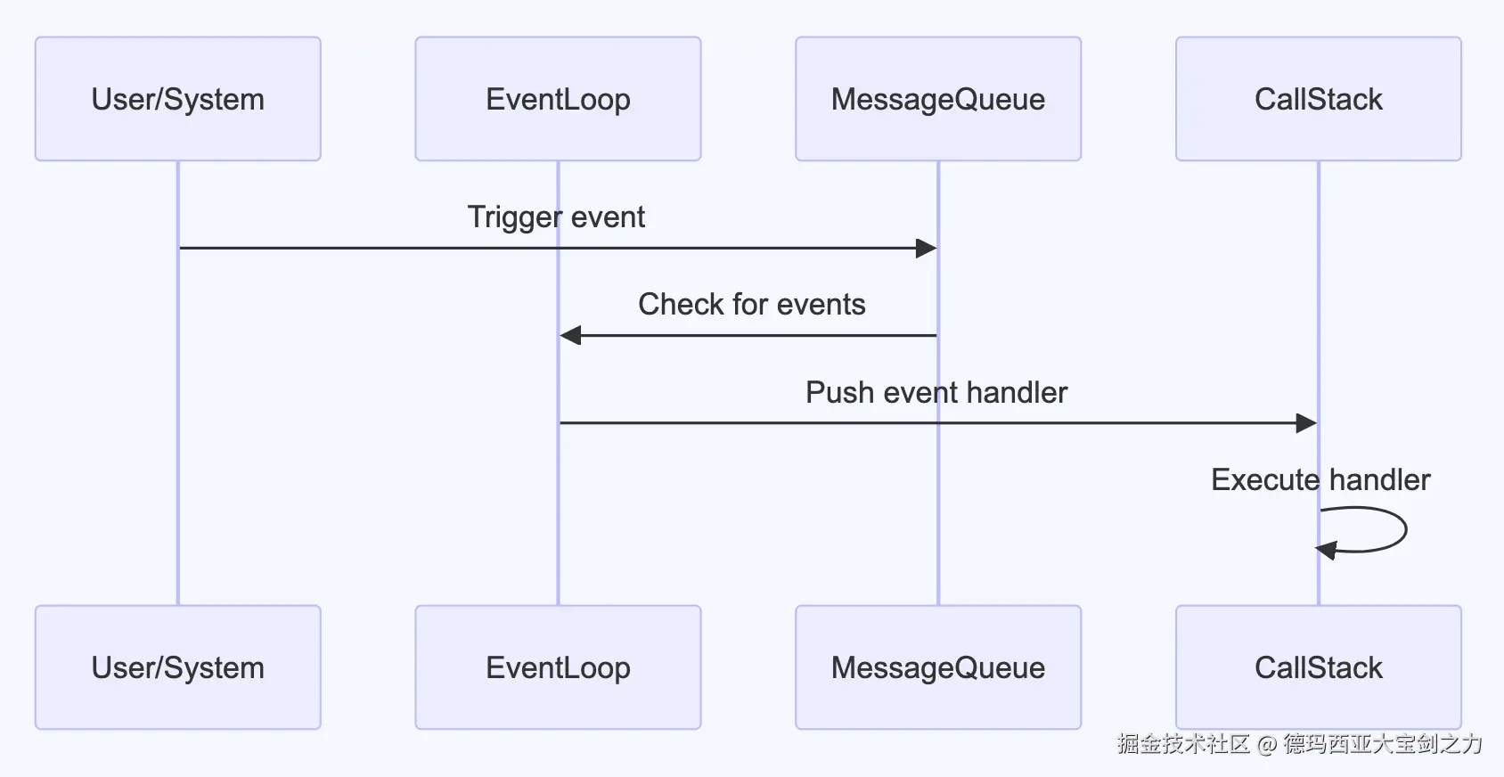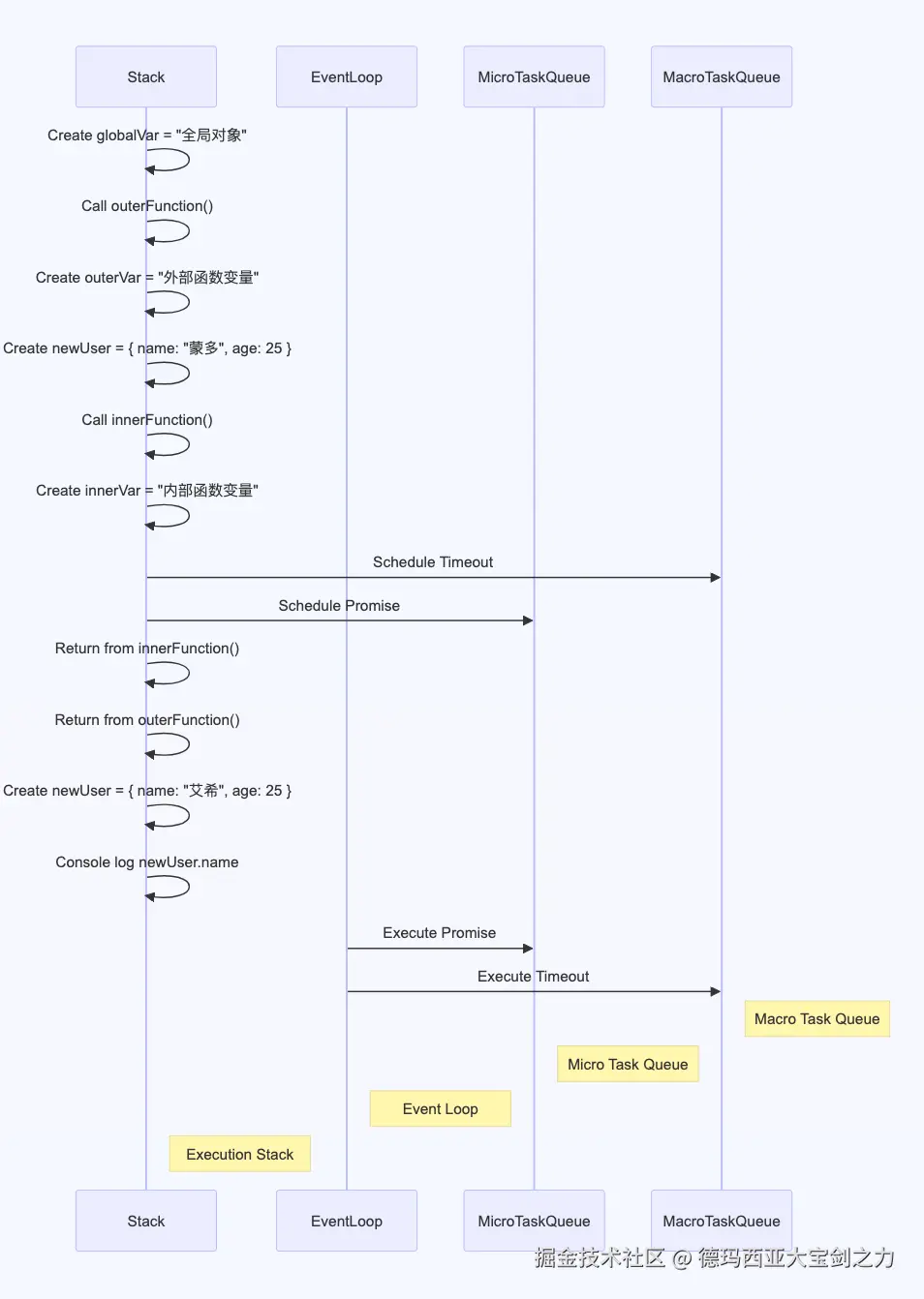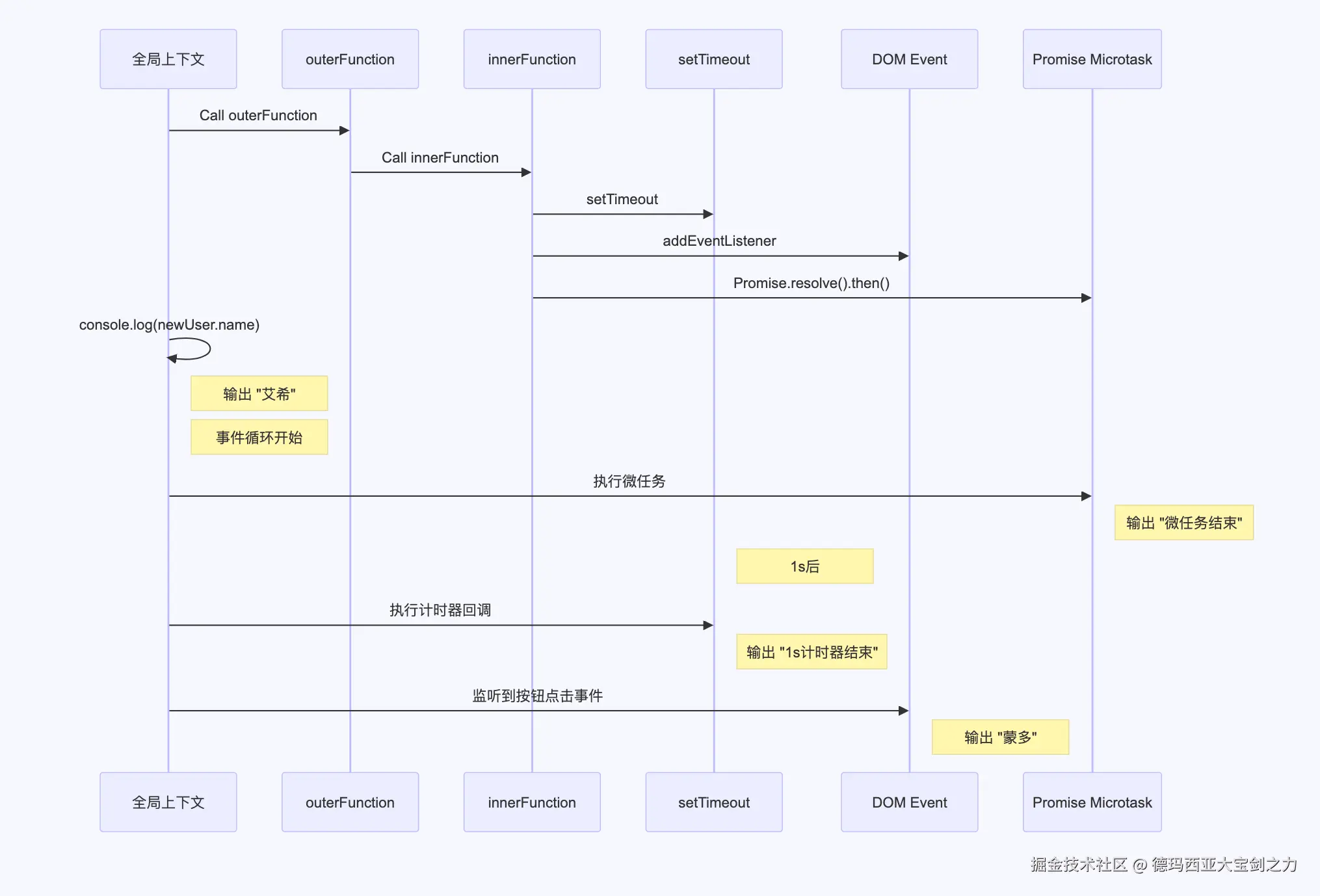 为了进一步研究,我们将调用时序进行简化,只保留事件循环、消息队列、调用栈