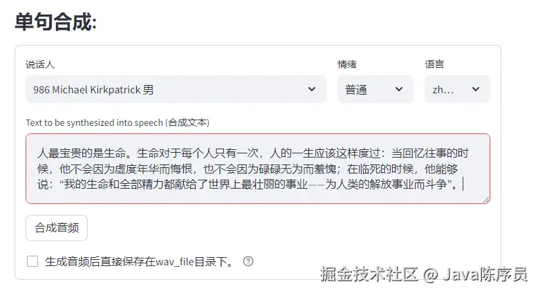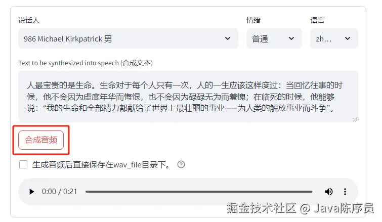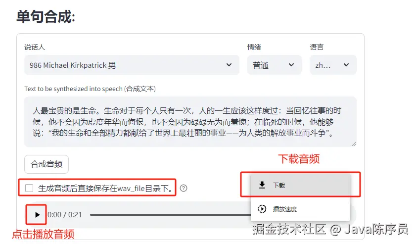 5、合成的音频可以进行在线播放和下载,或者在合成时勾选生成音频后直接保存在wav_file目录下