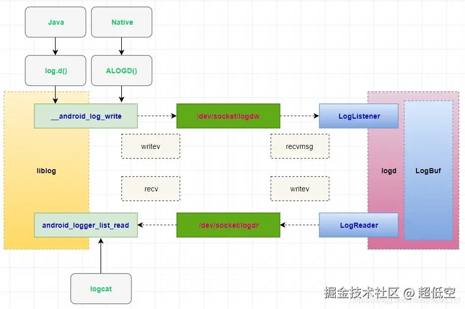 总结来说,Android 层的日志打印最终通过底层的 __android_log_buf_write 函数写入到 /dev/socket/logdw,由 LogListener 监听并处理。
