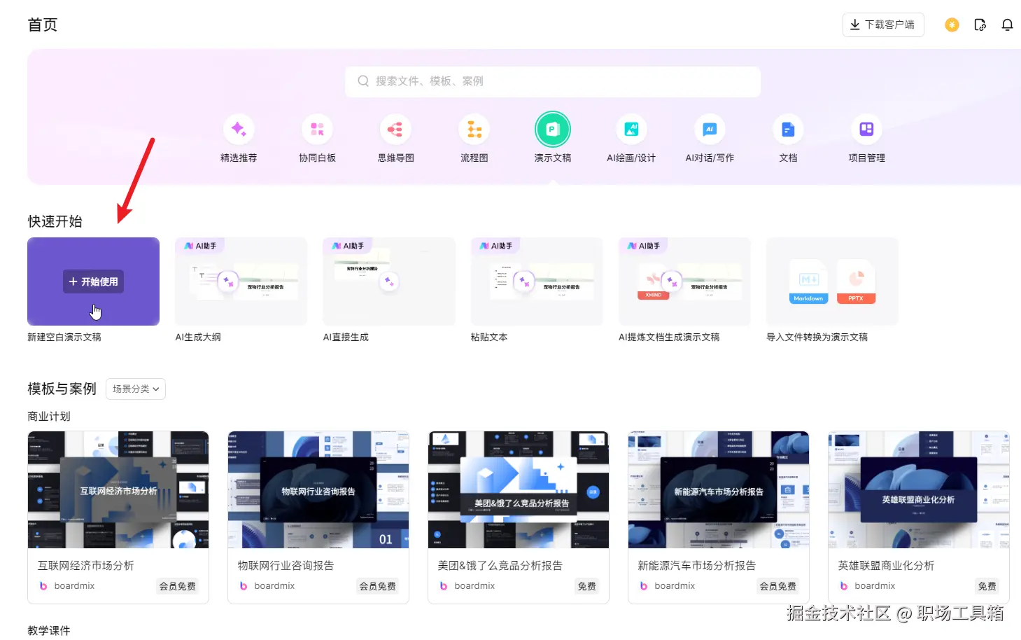 浏览器打开 boardmix PPT 首页,点击下方的新建空白演示文稿,在线创建一个 PPT 演示文件。