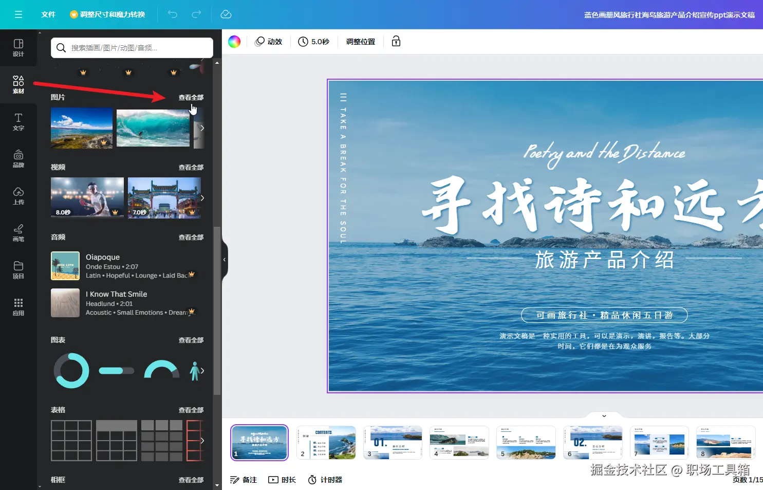 随机打开 Canva 的任意一个 PPT 模板,点击左侧的素材,滚动找到图片类别,点击右上角的查看全部,打开图片库,可以将图片素材插入 ppt 中。