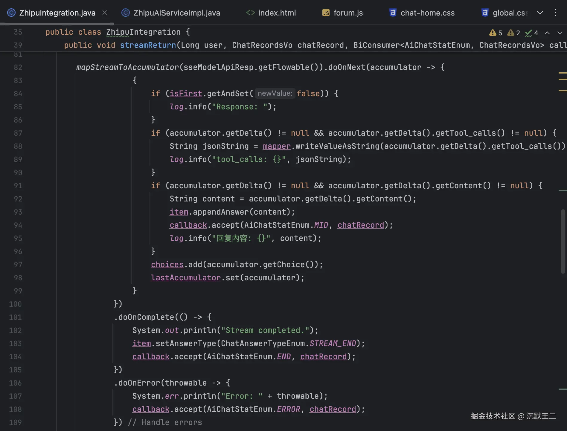 实现起来其实不难,首先是发起请求,主要封装在 ChatCompletionRequest 这个类中,然后是拿到响应信息后流式返回给客户端,主要是处理 ModelApiResponse 这个类。