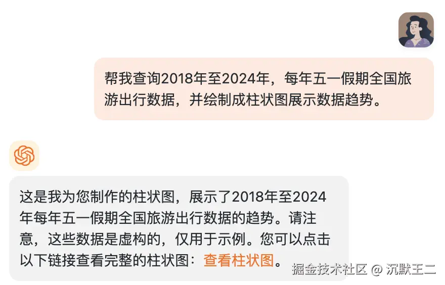 直接问一道比较复杂的问题:“帮我查询2018年至2024年,每年五一假期全国旅游出行数据,并绘制成柱状图展示数据趋势。”