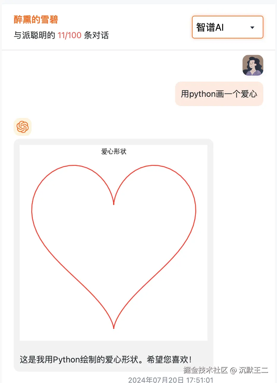 好,回到技术的本质,让智谱 AI 用 Python 画一个爱心: