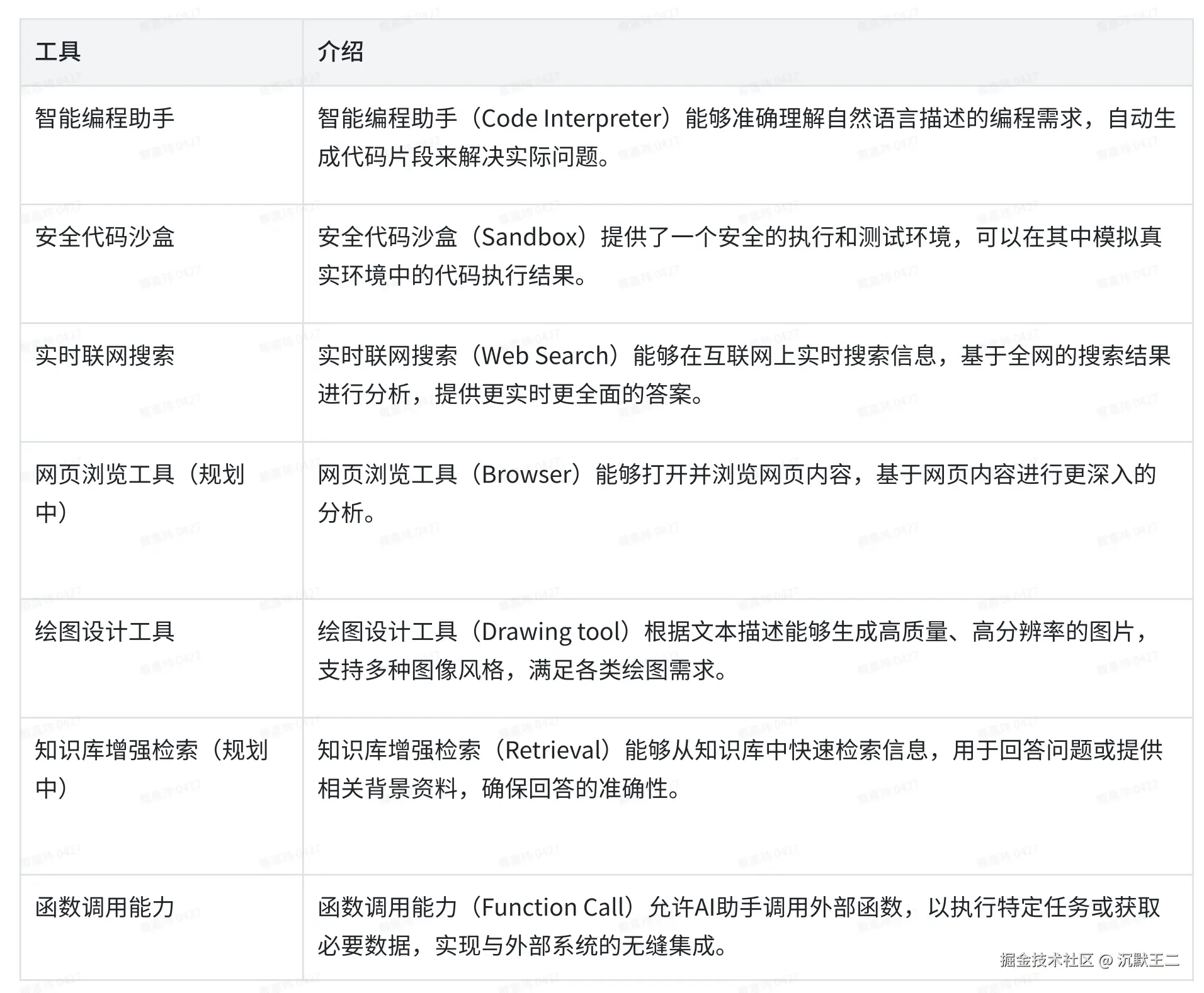 Alltools API 能够让我们在应用程序中构架高度专业化的 AI 助手,目前主要的功能有:智能编码助手、安全代码沙盒、实时联网搜索、绘图设计工具、函数调用能力等,未来还会有网页浏览工具、知识库增强检索等。