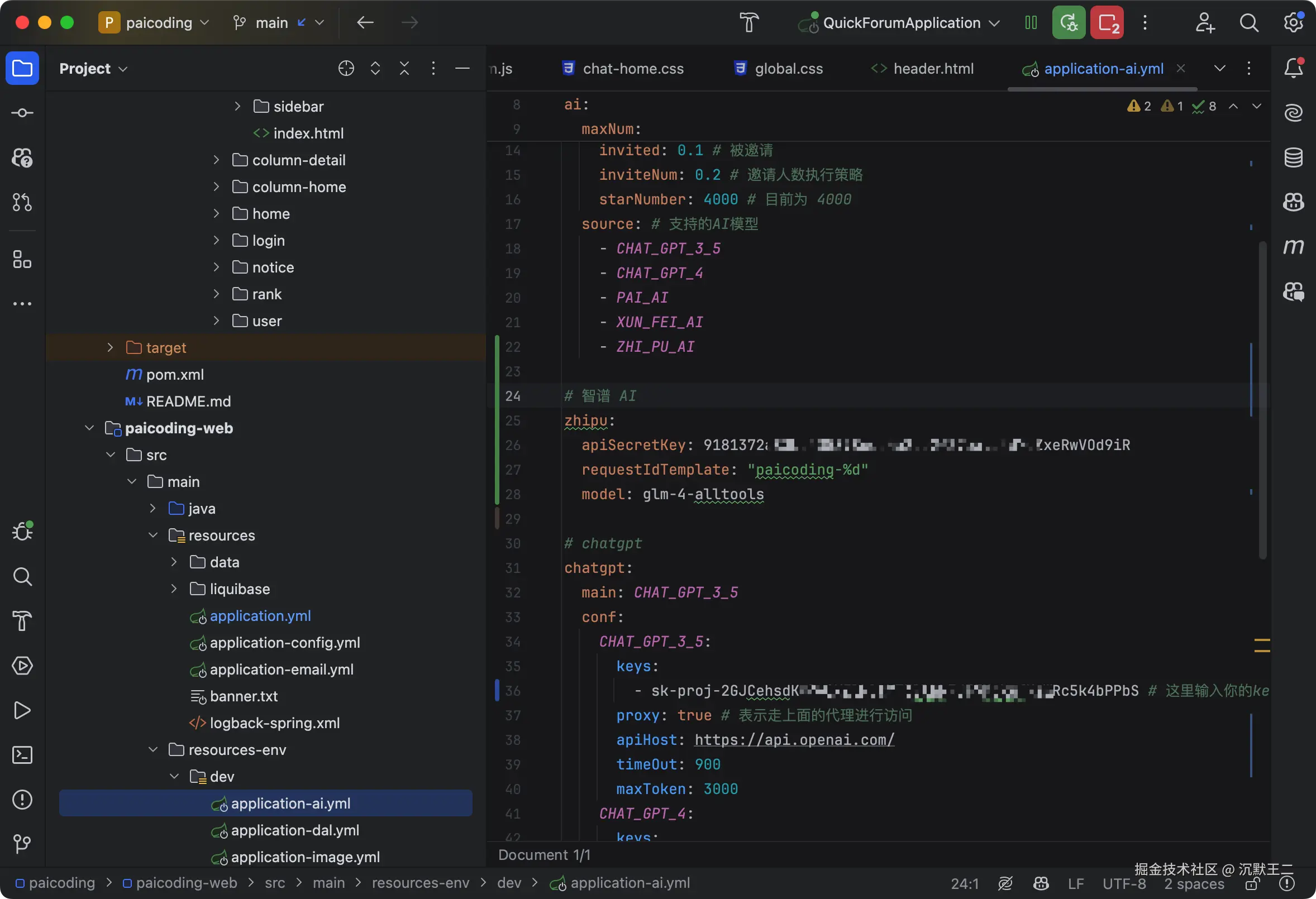第四步,在 application.yaml 中配置智谱 AI 的 API keys,模型为glm-4-alltools。