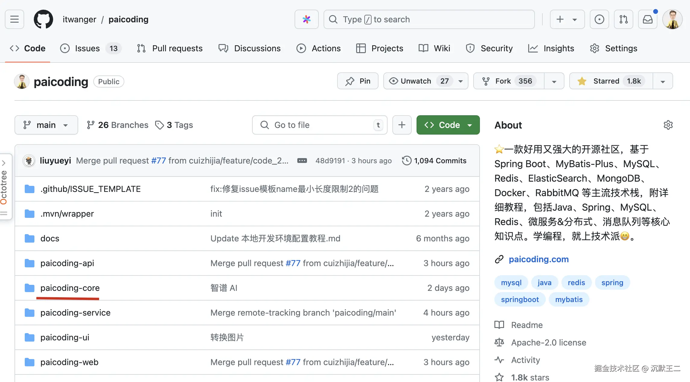第三步,拉取技术派在 GitHub 上的最新源码,智谱 AI 的对接主要在 paicoding-core 这个 module 下。