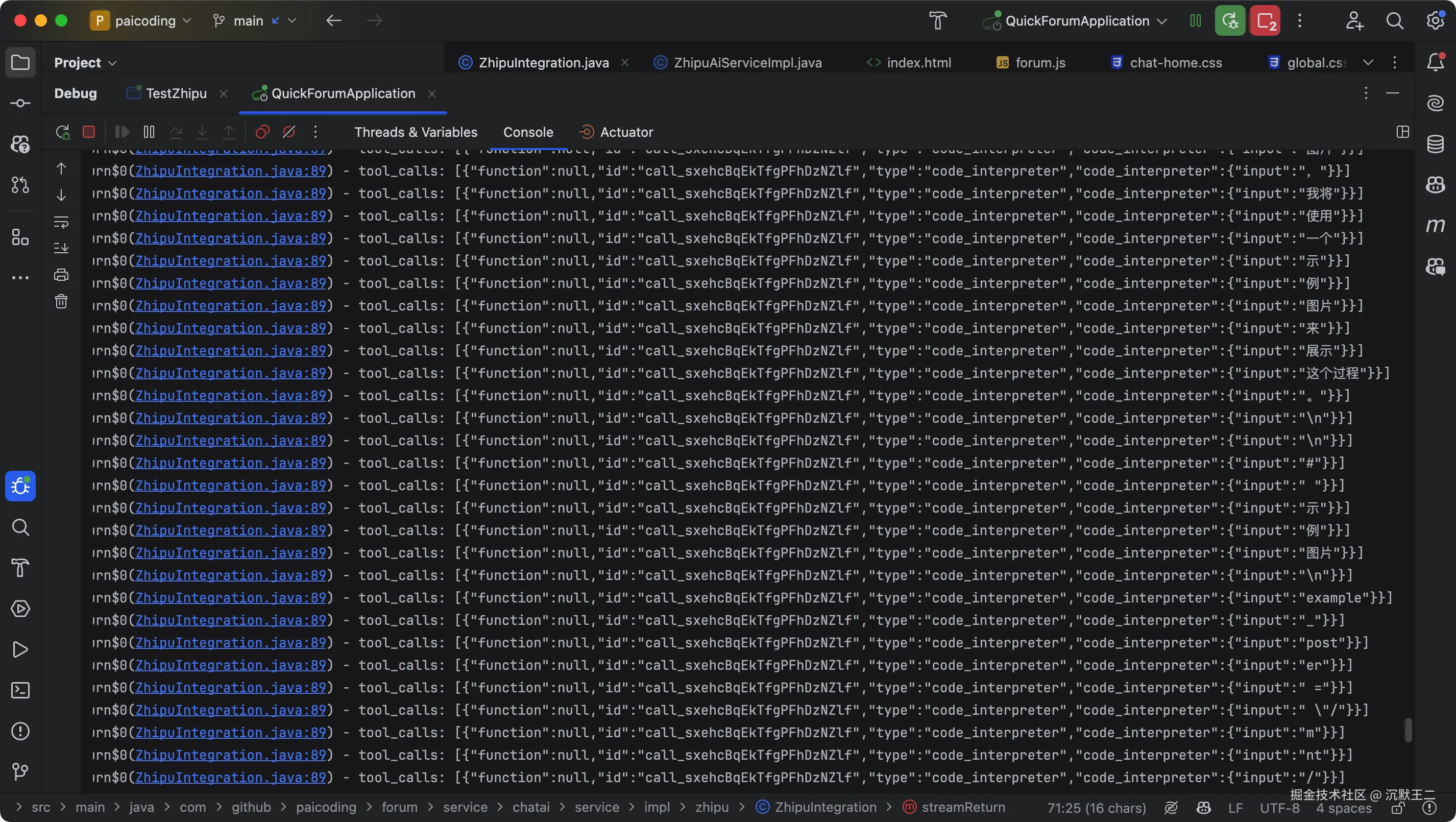 目前 AllTools 仅支持流式 SSE 输出,也就是大家看到的消息一点一点在对话框中显示的效果,后台打印的信息其实是这样的,也是一点一点的从智谱 AI 那里得到响应。