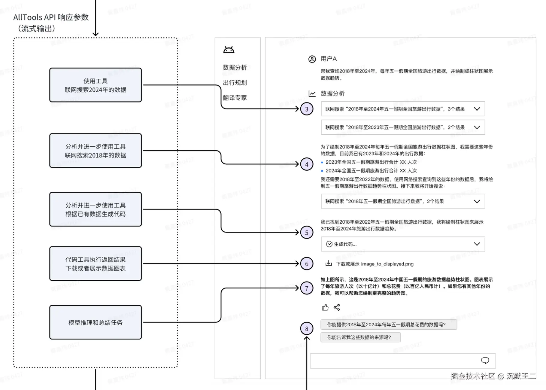 用流程图来展示,其实是下面这样的,智谱 AI 会先联网查询,然后将数据汇总,并且根据数据绘制柱状图,生成图片后返回返回响应结果。