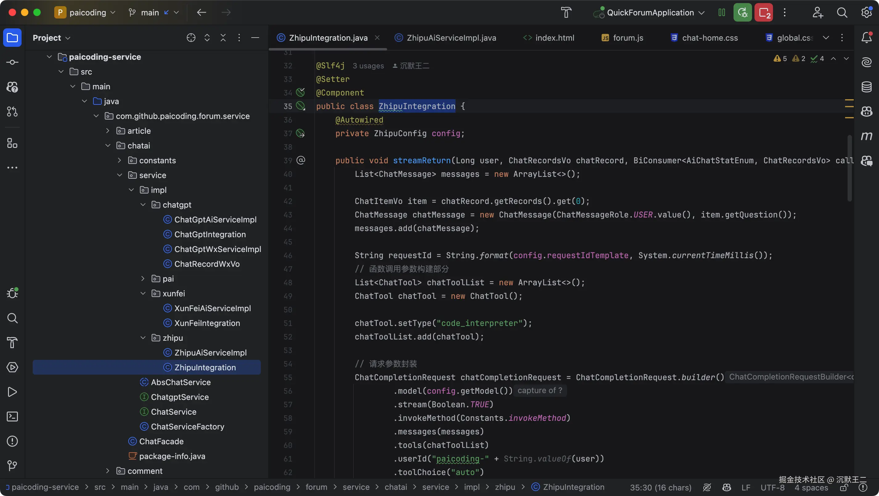 关键对接起来也非常的方便,仅需要四步就完成了。技术派的前后端通信采用的是 WebSocket 这种形式,能够比较实时地将智谱 AI 的数据返回给用户,自我感觉实现还是非常优雅的。