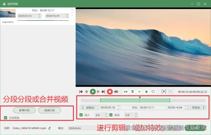 步骤4:录制结束后,预览视频或者进入 【高级剪辑】 页面,您可以对视频进行剪辑、增加特效、还可以对视频进行快速分段,接着点击 【剪辑】 按钮结束此次录制与剪辑。