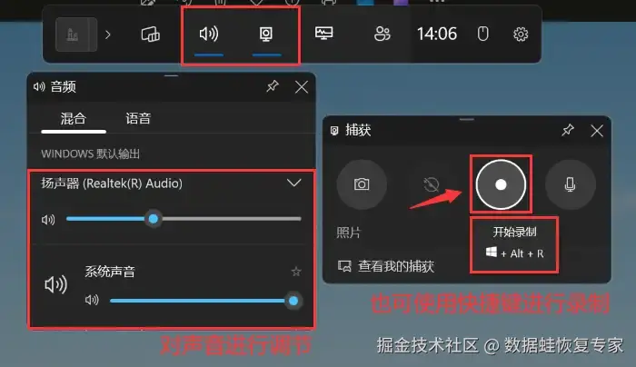 步骤4:在打开Xbox Game Ba录屏功能后,也可以使用热键 【Win+Alt+R】 快速录制。