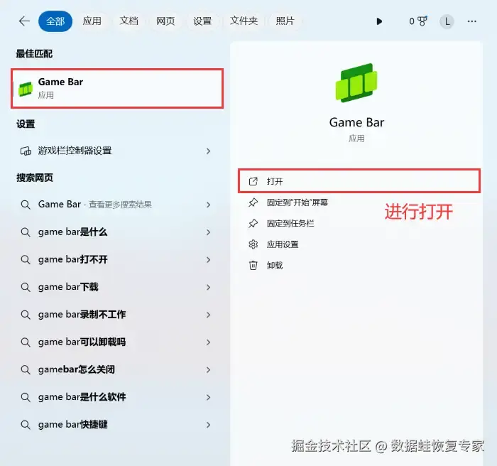 步骤1:在电脑的左下角搜索 【Game Bar】 并进行打开。