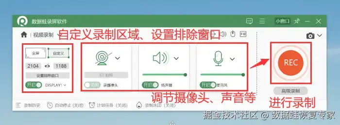 步骤3:在 【视频录制】 界面,您可以自定义录制区域和设置排除窗口,在录制过程中保护好您的个人隐私,对摄像头、麦克风等进行调节,设置完毕后点击 【REC】 即可进入录制。