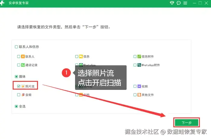 第二步:在软件最新的页面上,你可以选择 【照片流】 或其它需要恢复的选项,然后开始扫描。