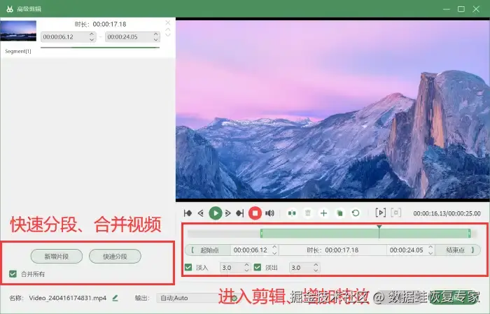 步骤3:录制完成的视频,您可以直接预览查看视频,调节视频的音量,点击 【完成】 保存视频。如果需要对视频进行更多的处理,可以点击进入 【高级剪辑】 页面对视频进行快速分段、剪辑、增加特效等操作。