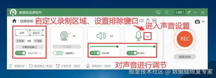 步骤2:在 【视频录制】 页面,对录制区域和摄像头、声音等进行调节。点击麦克风旁边的倒三角标志可以进入 【声音调试设置】 ,对录制的声音进行调整,同时还可以进行试音测试。设置完毕后,返回页面点击 【REC】 进行录制。