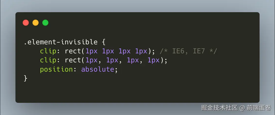 这种方式并不是很常见,因为我们本身在业务中使用 clip-path 的场景不多,这个属性主要的功能就是将元素剪裁成显示区域为一个 1px * 1px 的矩形,这样就在视觉上实现了隐藏元素的效果