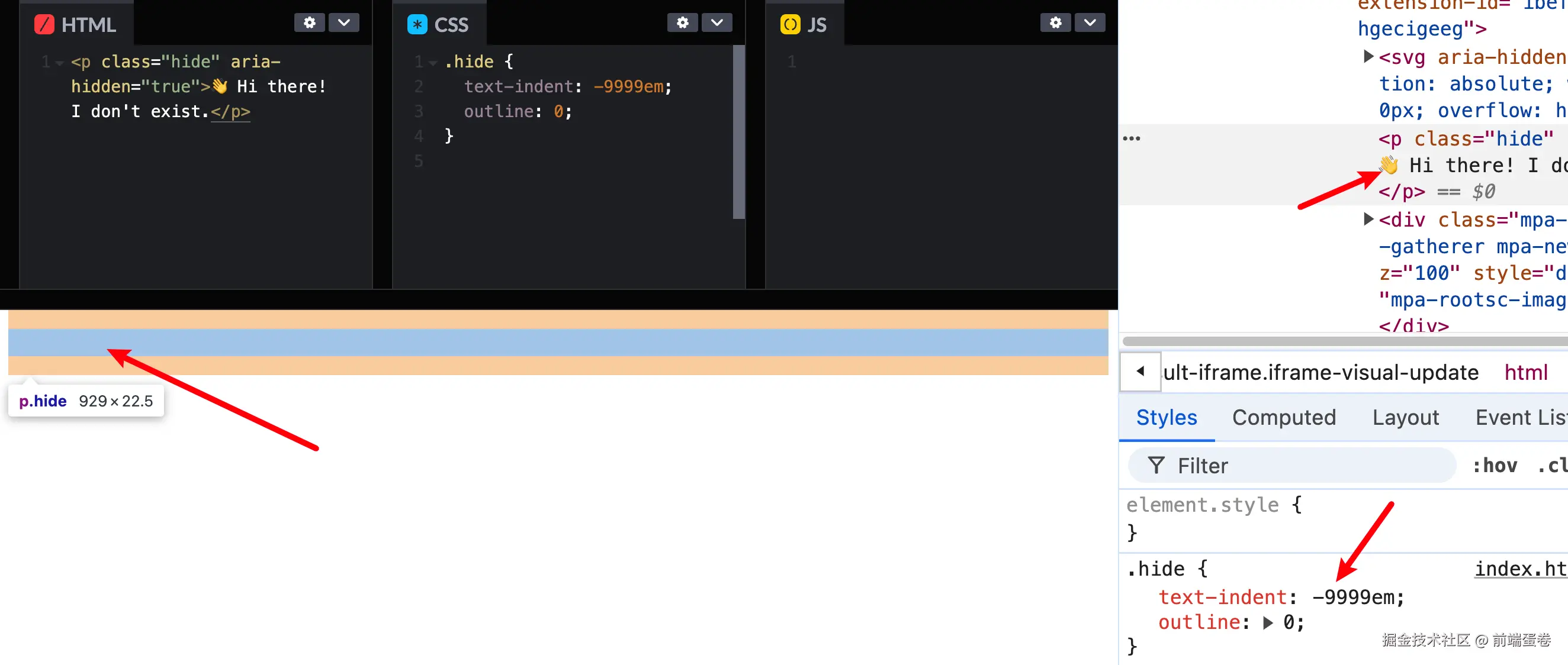 text-indent 设置区块元素中文本行前面空格(缩进)的长度, 因此如果我们想要隐藏的元素是文本内容的时候,我们就可以使用这个属性将文本缩进到视口范围之外,从而达到隐藏的效果。