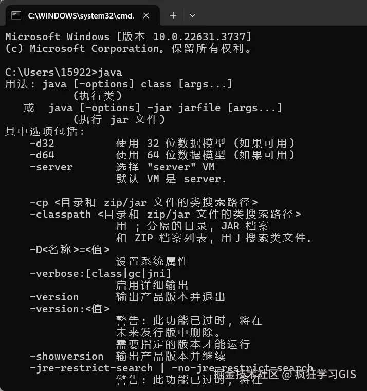 随后,在其中输入java,如果出现如下图所示的界面,则表示电脑中已经有Java环境了,即前述配置正确。