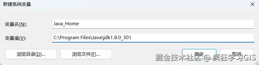 接下来,变量名设置为Java_Home,变量值则设置为前述安装路径中,带有jdk字样的那个文件夹的路径——在本文中,这里的路径就是C:\Program Files\Java\jdk1.8.0_301。设置结果如下图所示。