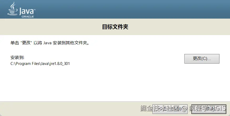 随后,是JRE安装路径的选择,大家同样结合实际情况选择安装路径即可;如下图所示。但是要注意,建议将此处JRE的安装路径的前缀,选择为与上图中JDK的安装路径一致的路径——也就是二者除了最后一个文件夹的名称不一致,前面的路径尽量是一致的;这样方便我们后期对配置文件的管理。
