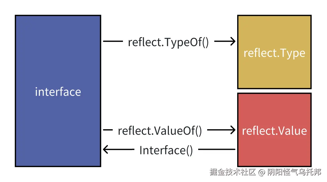 1.对象类型转换。通过TypeOf和ValueOf方法,可以将interface变量转化为反射类型对象Type和Value。通过Interface方法,可以将Value转换回interface变量。