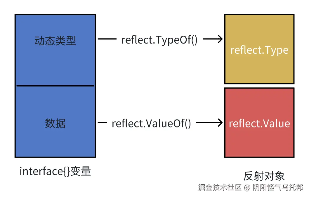 reflect.ValueOf获取interface底层的Type和数据,封装成reflect.Value对象。