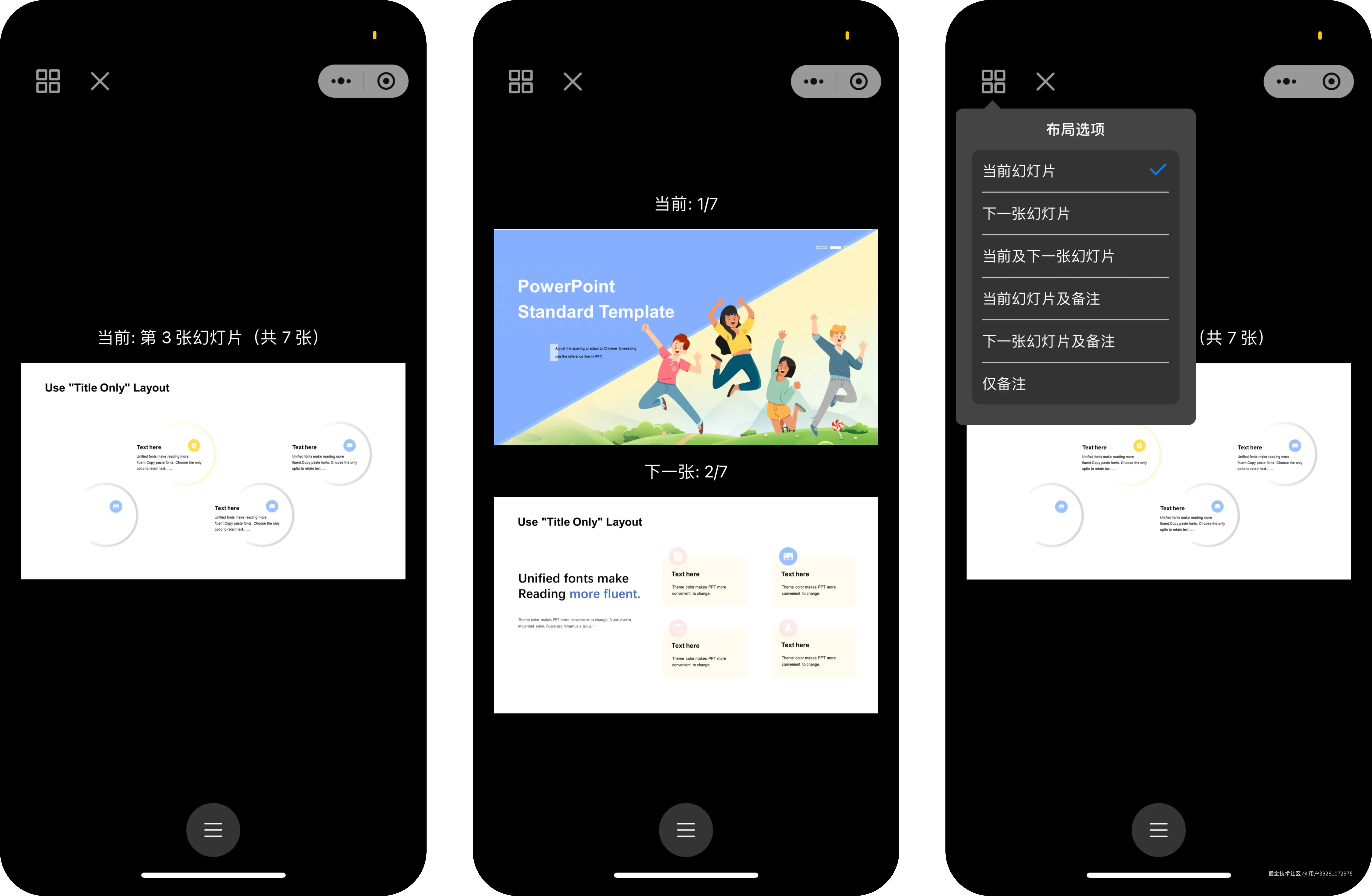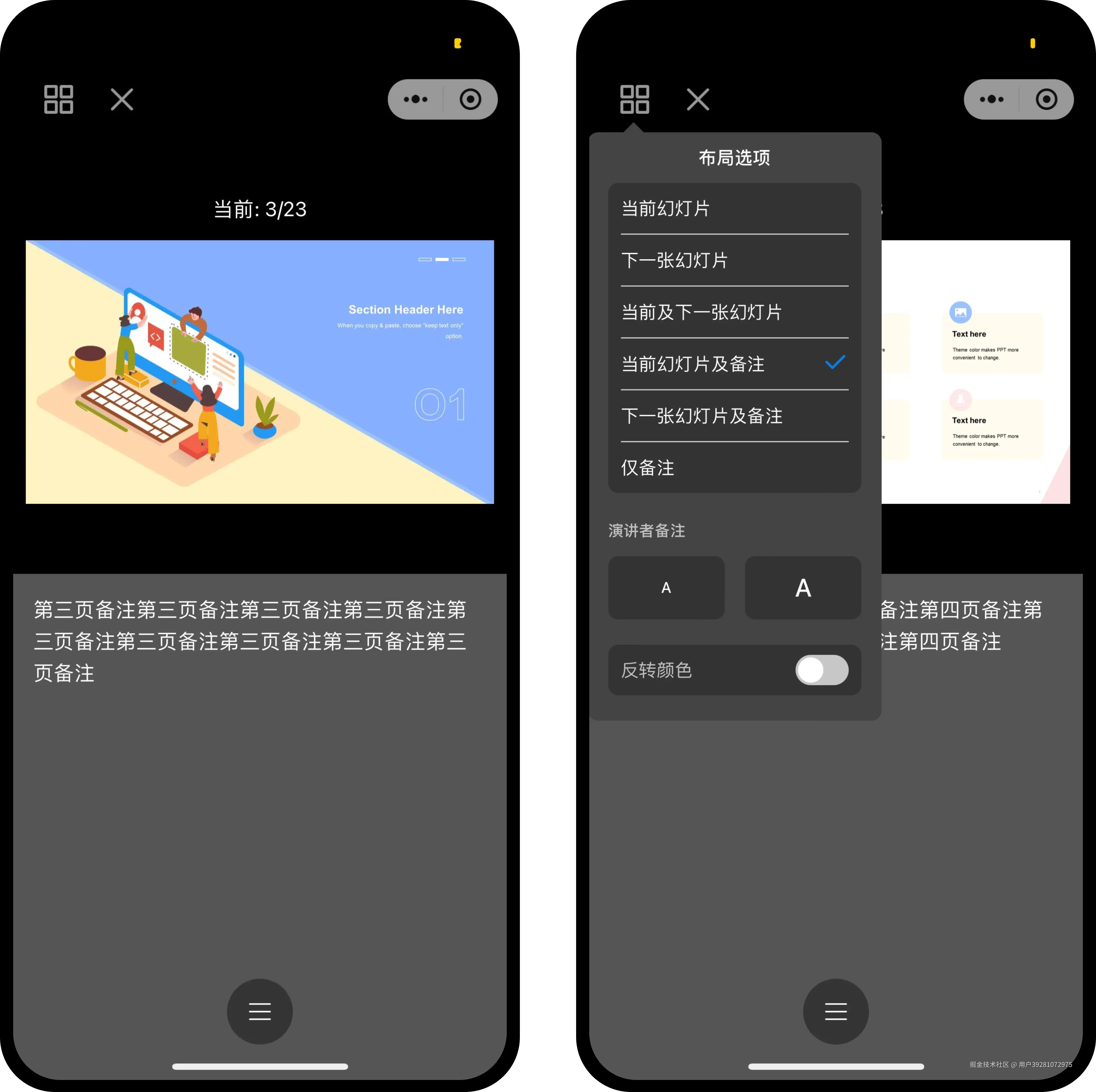 升级后的 PPT 手机遥控器支持展示整页幻灯片,你可以选择展示当前页或当前页及下一页。这样,就能轻松掌握演讲进度,再也不需要在演讲时思考下一页的内容了,也减少了准备演讲的压力!此外,你还能在遥控器上查看备注内容,调整字数大小,确保演讲不遗漏任何细节。