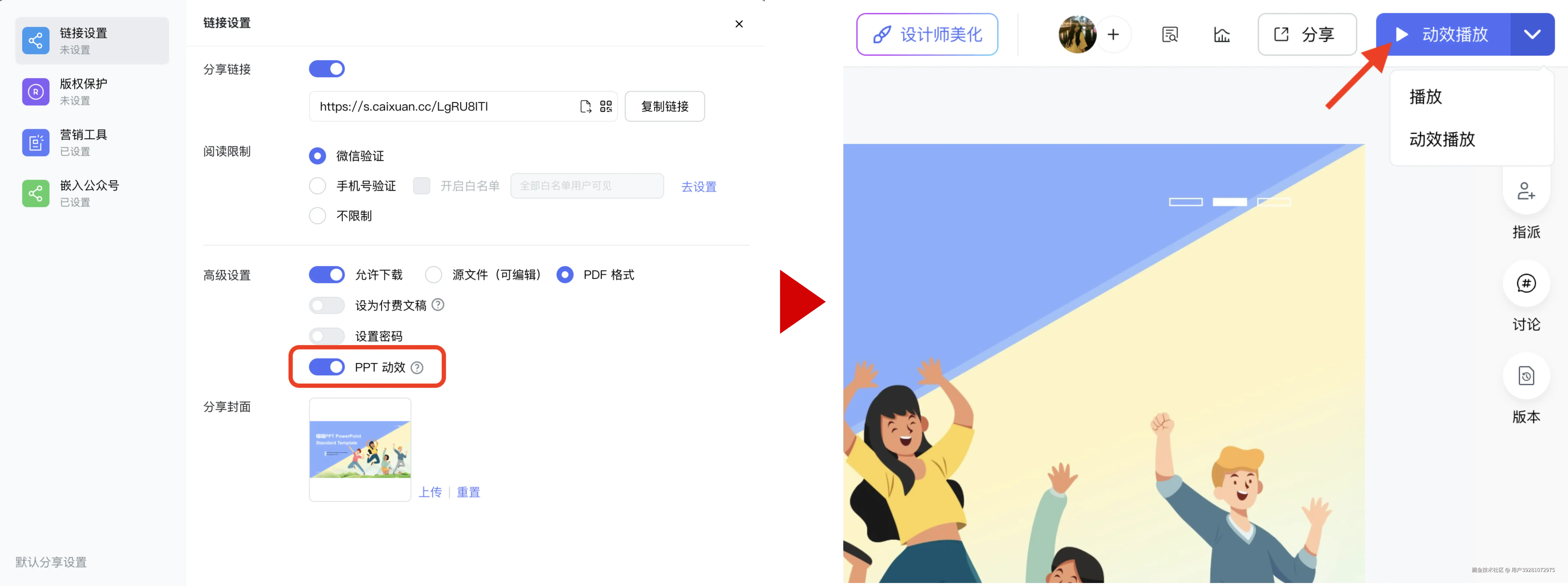 注:若 PPT 中带有切换页面动效,请在「分享设置」中开启「PPT 动效」后进入「动效播放」模式。