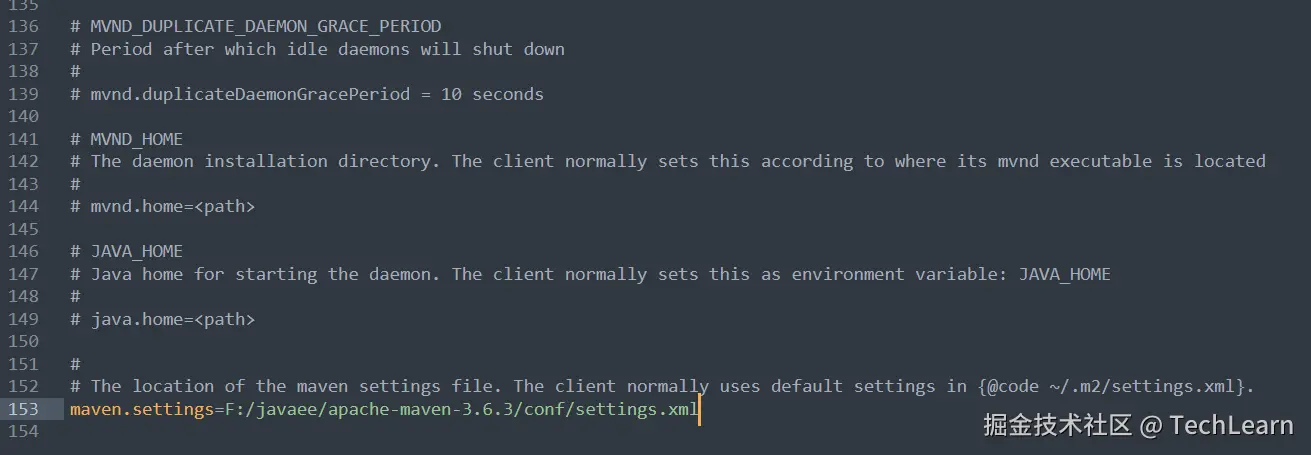 打开 Maven-mvnd 安装目录下 的 /conf/mvnd.properties 文件,在文件最后一行,修改如下:
