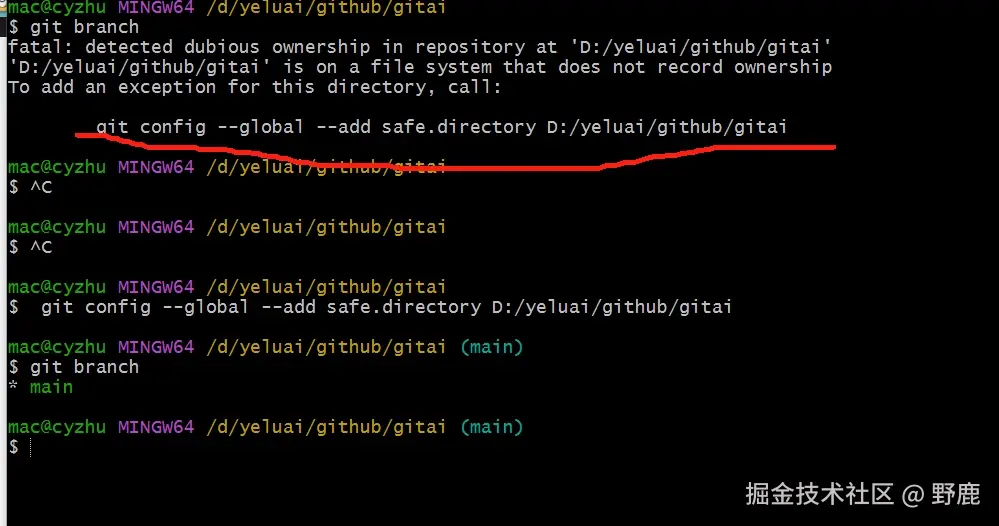 git config --global --add safe.directory D:/yeluai/github/gitai