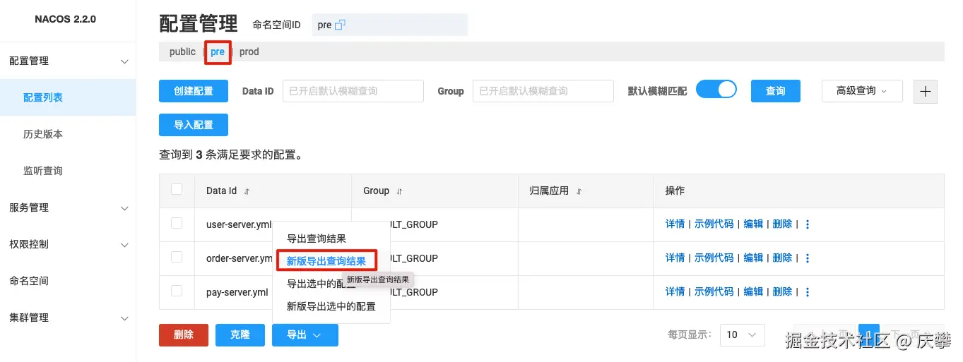 - 把配置导入r-nacos 分别把上一步nacos导出的配置文件包导出到r-nacos pre、prod命名空间下的配置。